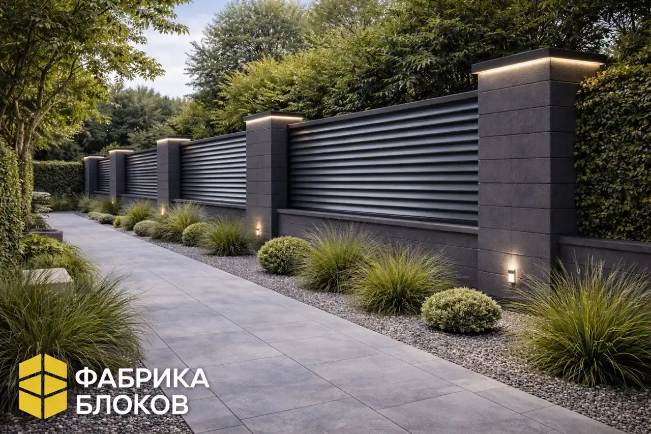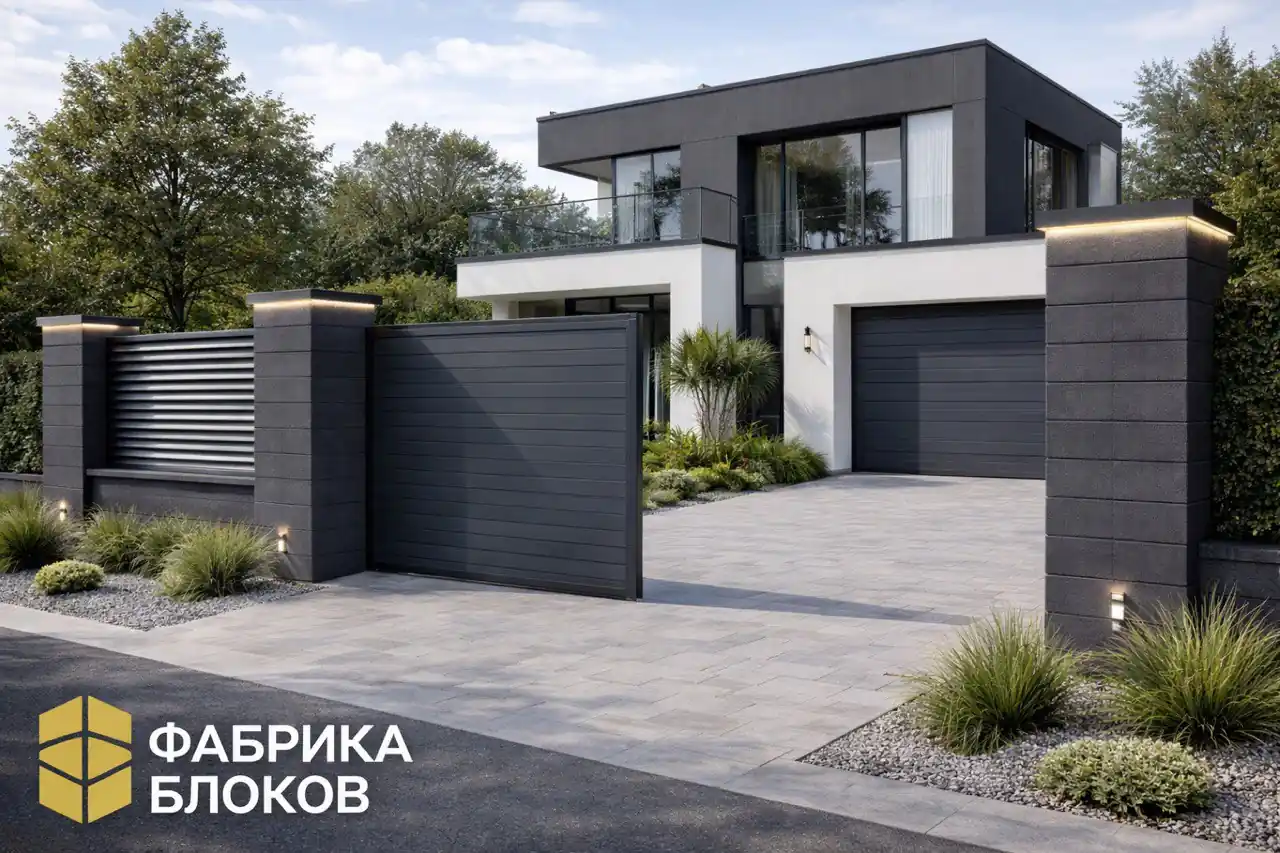 Антрацит подчёркивает современную архитектуру, хорошо сочетается с панорамным остеклением, металлом, тёмной кровлей и воротами в чёрных оттенках.